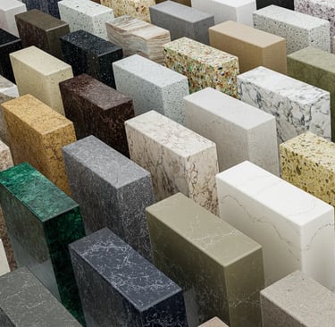 A durable engineered stone made from natural quartz crystals and resins. It's non-porous, resistant to stains, scratches, and heat-offering a clean, elegant finish.